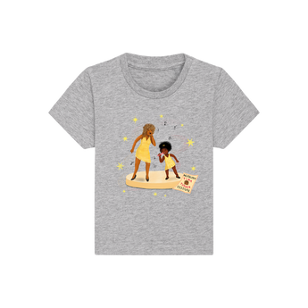 'Nutbush festival' kids t-shirt in grey inspired by the upcoming children's book 'Just Like Tina - Inspired By The Life of Tina Turner' by Ebony Lynn Mudd, featuring chest design by the book's illustrator Maruga Koops.